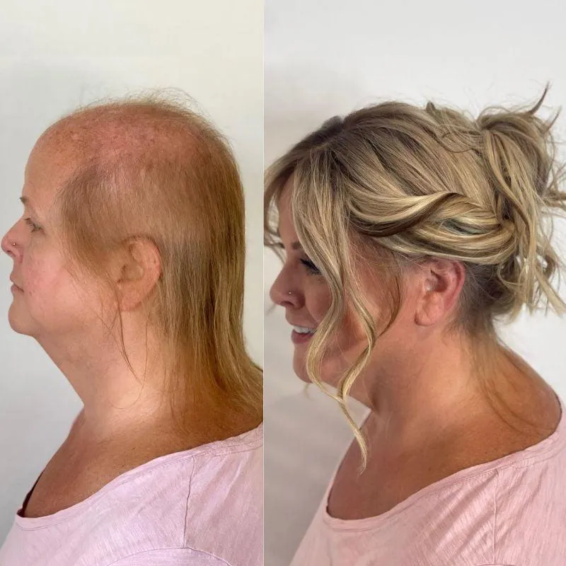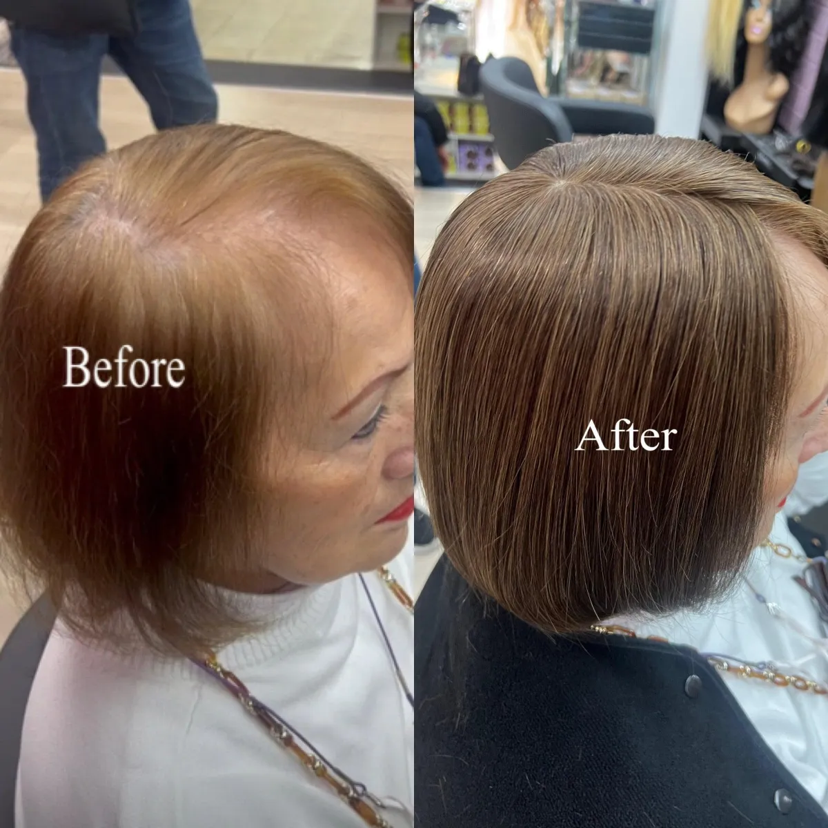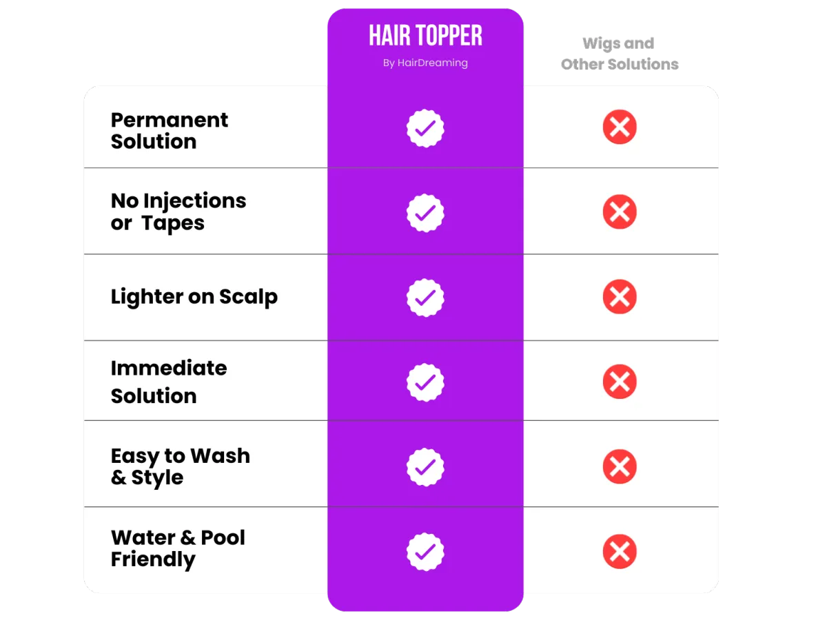 With our permanent hair topper, you leave your topper in place while you sleep, swim or shower. And that's great news for those with more noticeable stages of thinning hair or hair loss who want 24/7 coverage. Natural looking because it's human hair Long lasting, secure fit Perfectly matched to your color